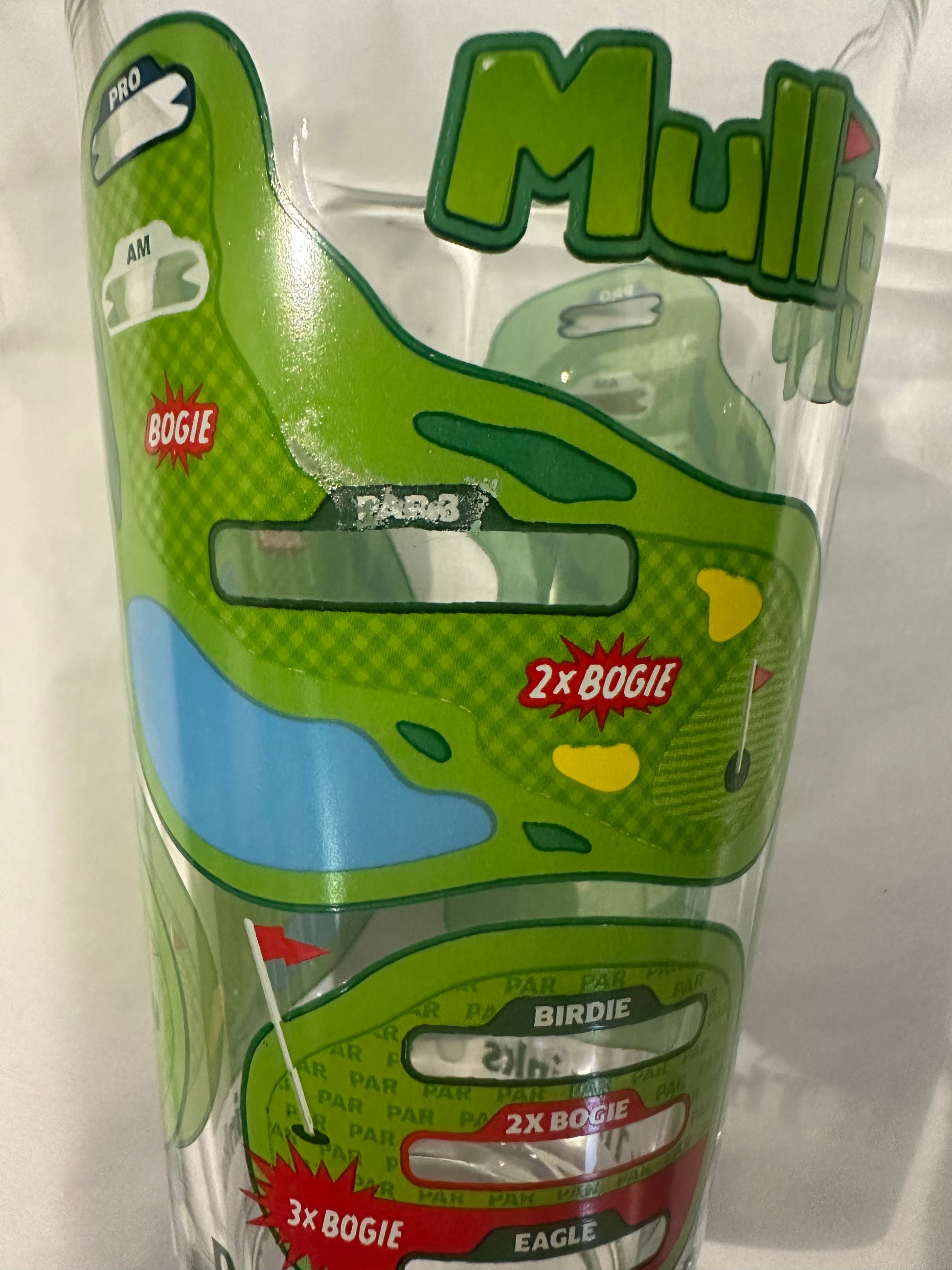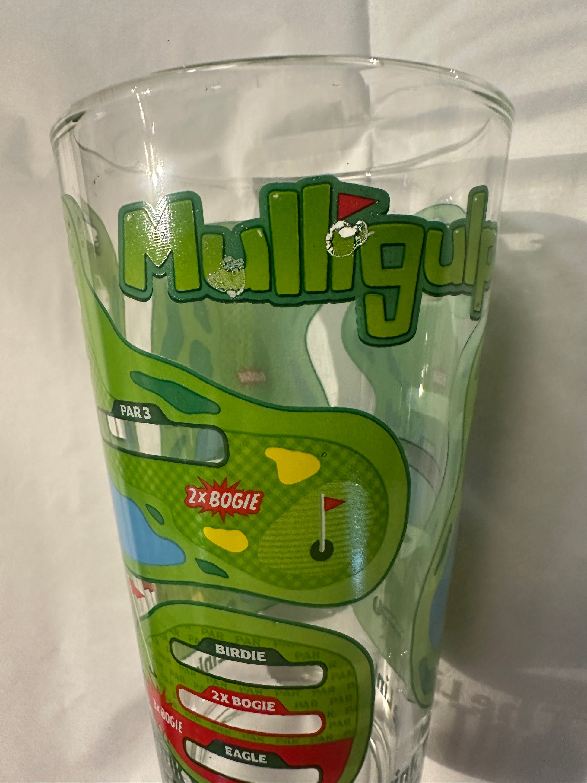 Glasses have damaged printing, fairway print graphics contain blemishes, pock marks and some variance in scoring windows. (No glasses are chipped or cracked all blemishes are in graphics.)